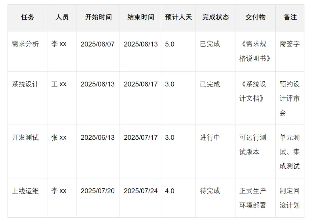 拟定工单系统从需求分析到上线运维的全周期计划,明确时间节点和交付的东西。数据表格如下图所示。