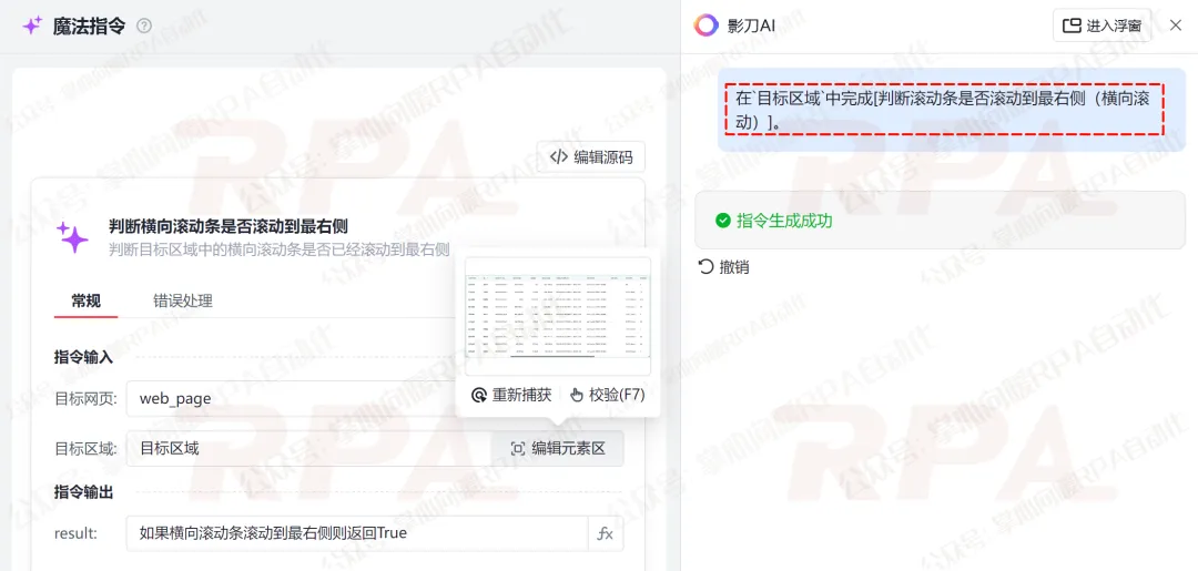 生成的指令会:执行JavaScript获取滚动条位置信息,判断横向滚动条是否滚动到最右侧。我们可以根据其判断结果,来判断PixPin的“自动截图”功能是否执行结束。