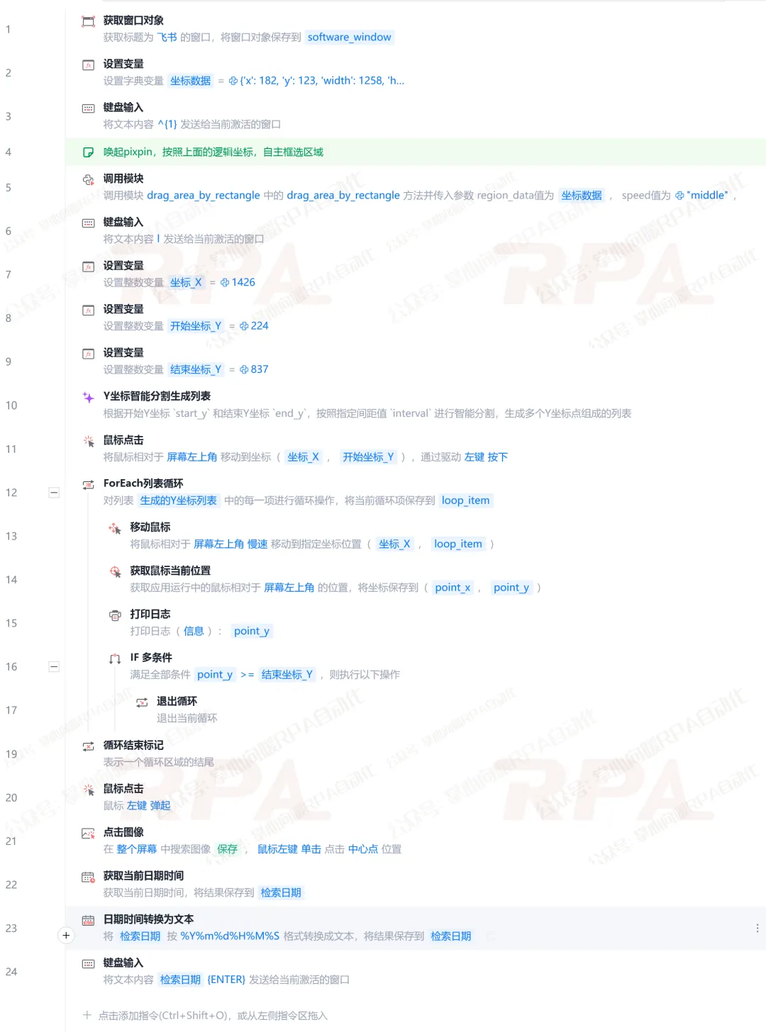 桌面端:桌面端有滚动条,但是很多时候我们很难捕获到,这里可以【基于起终点计算出离散坐标列表,利用‘按住鼠标’配合‘Foreach循环’进行分段位移,并通过实时比对当前Y坐标与终点Y坐标】来判断是否滚动到底,这是一种非常底层、稳定可控的方案,同样适用于网页端。