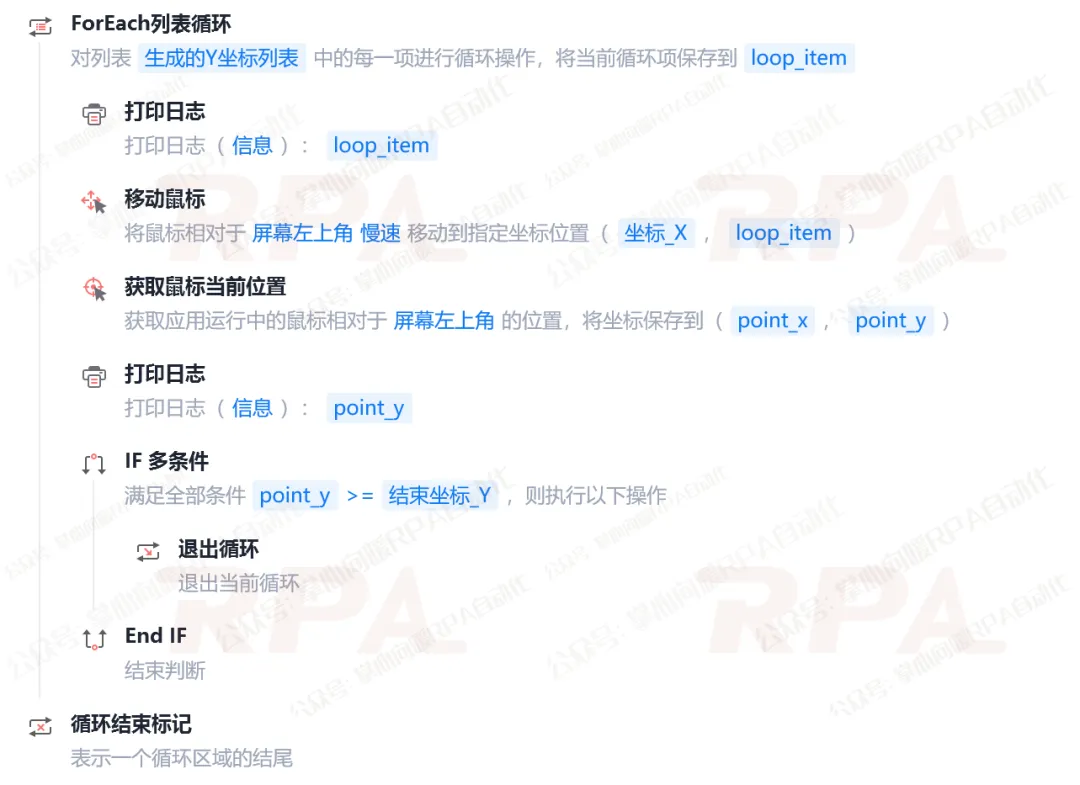 IF 判断:如果”当前Y坐标 >= End_y”,说明已经拖到底了,执行”退出循环”。否则,继续下一次循环,往下拉一段距离。
