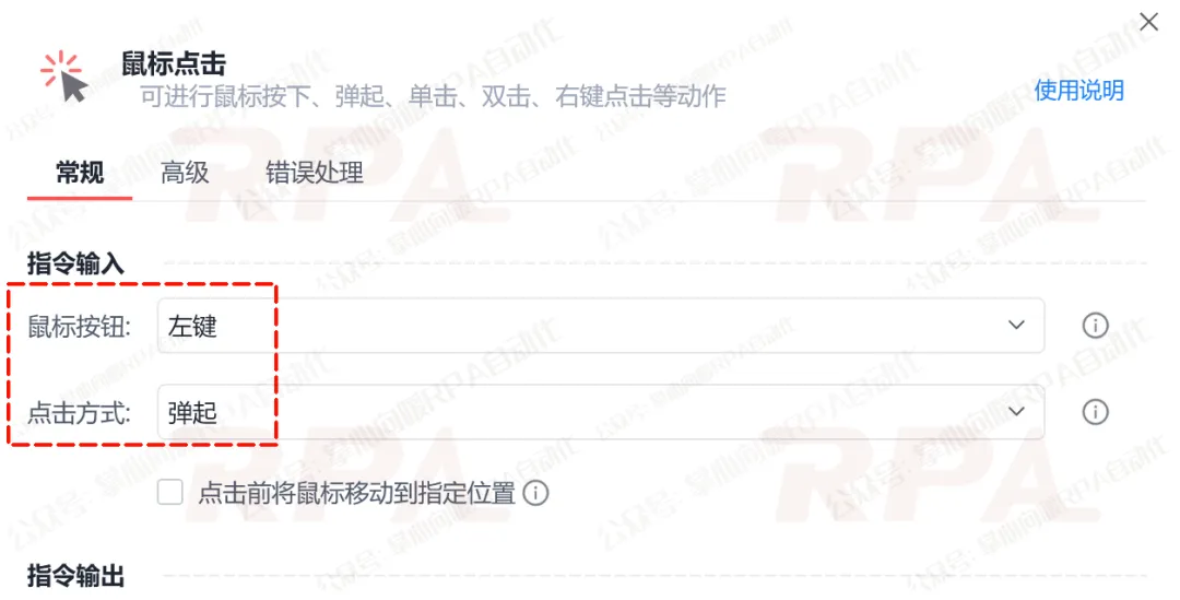 使用”鼠标点击”指令,先将鼠标指针精确移动到滑块的起始位置,”点击方式”选择“按下“,此时,鼠标状态变为”拖拽模式”。