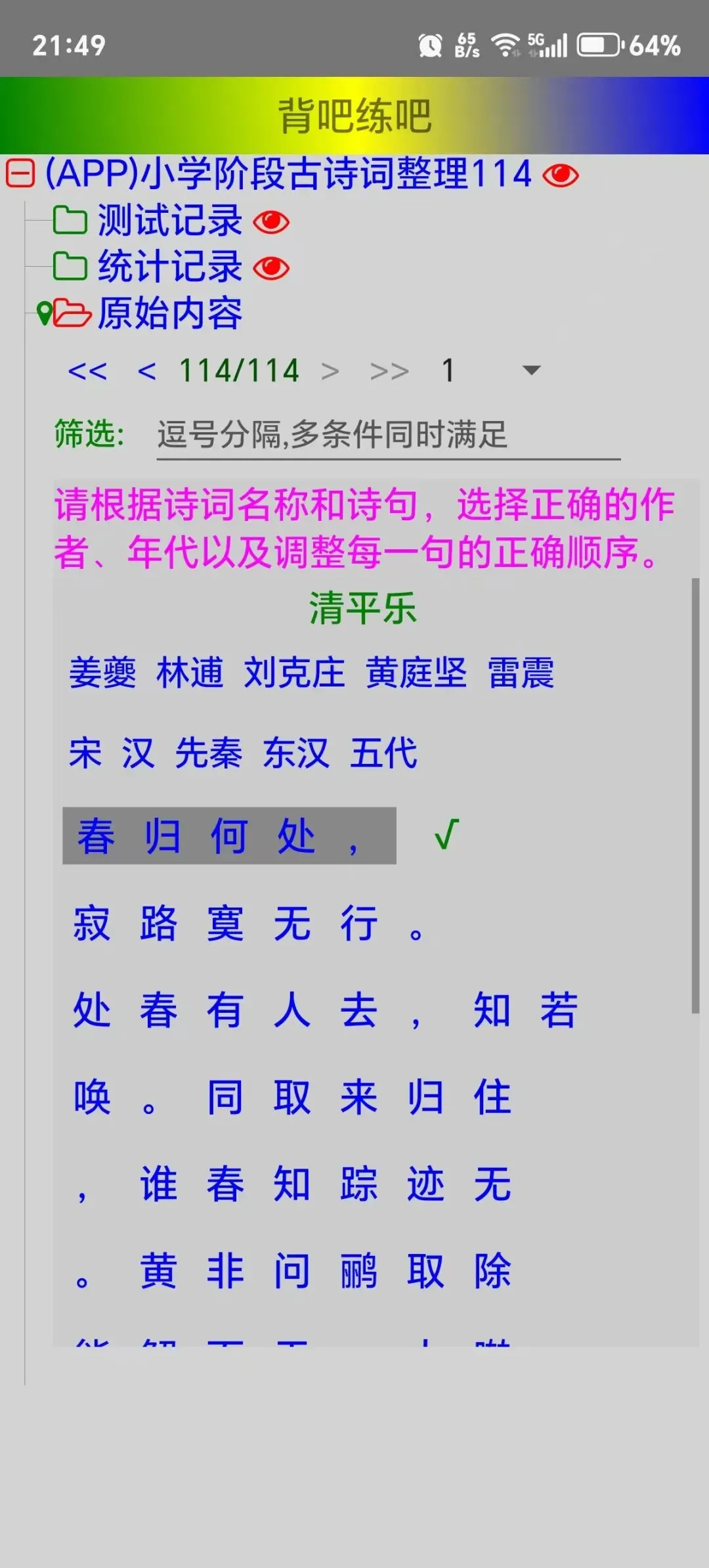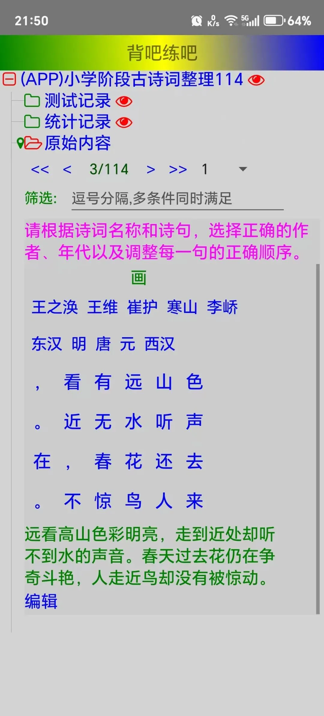 1、古诗词。①作者和朝代都是普通的选择题。从诗句正文开始,每一行的顺序都是随机的,用户需要按照正确的诗句顺序逐个点击…见下图。注:如果出现错误或欠妥的内容,请点击注解下方的【编辑】自行修正即可。