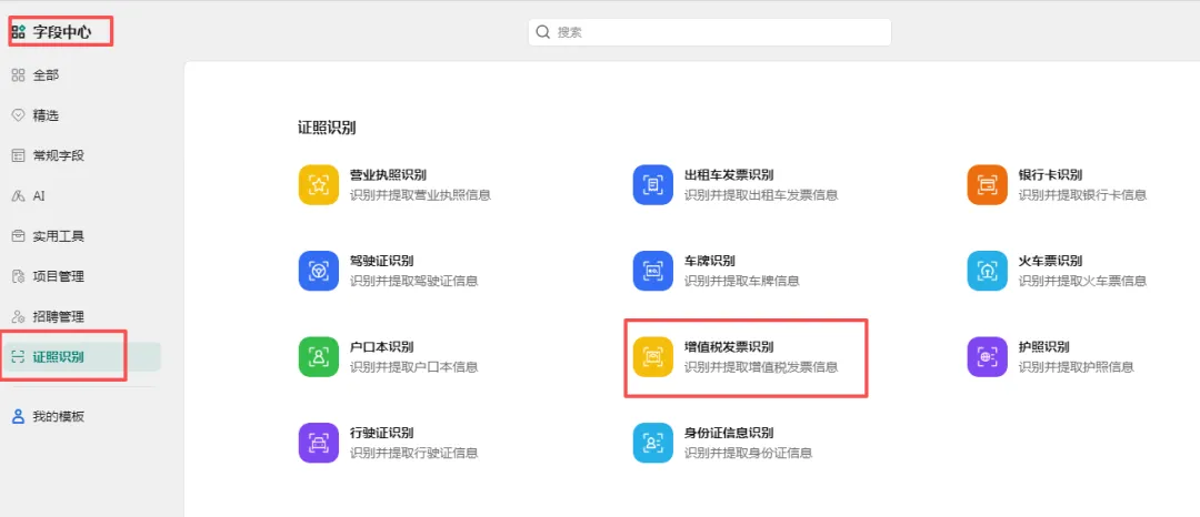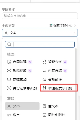 新建一个字段,选择“增值税发票识别”开始体验。如果没找到请点探索字段中心。