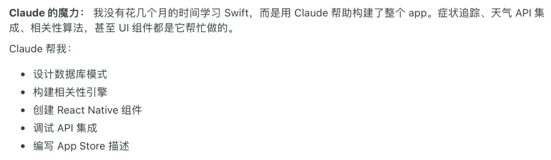 在海外的Reddit论坛上,小雷看到了很多用Claude开发应用的帖子。有一位用户表示,由于他长期饱受慢性鼻炎困扰,因此想用一款App记录睡眠、饮食、天气等数据,以发现这些因素和鼻炎症状发作的相关性。这位用户不懂Swift编程语言,直接让Claude Code帮他设计数据库模式、构建相关性引擎、调用各类API,甚至App在App Store中的文字介绍,都是Claude帮他直接生成的。