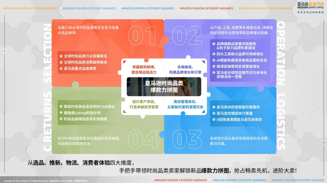 《2025 亚马逊消费品类.pdf》聚焦美欧日时尚品类,重点拆解浅蓝、水鸭绿等流行色与缎面、钩针等面料趋势,推荐女装阔腿裤、男装半拉链上装等潜力单品。报告涵盖 AI 工具、促销策略、库存管理等实操方案,助力降低退货率。