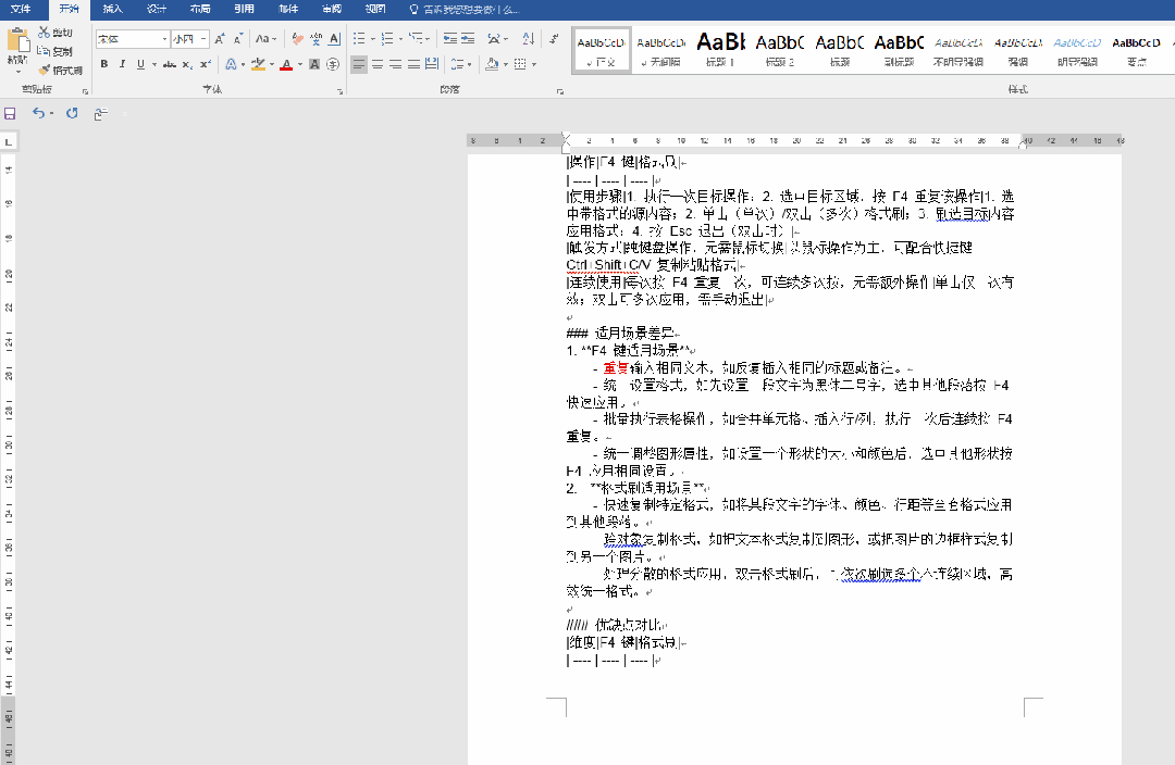 应用场景:给文字加粗,给文字标红,有时候需要用格式刷,但对于简单的操作,比如标红,修改字体大小或者修改行距,其实有个更简单的方法就是F4功能键