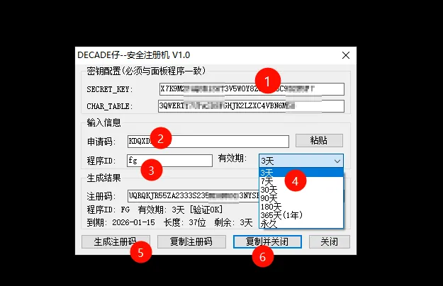 🔑设置密钥:使用默认密钥或自定义SECRET_KEY和CHAR_TABLE(必须与注册机保持一致)