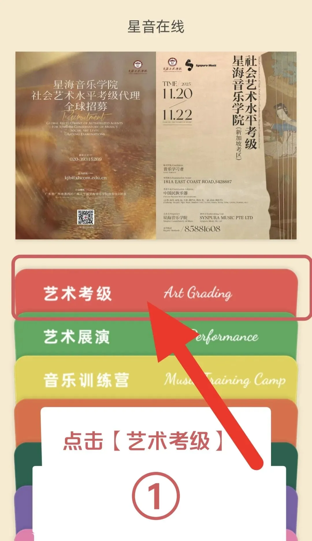 下载打开“星音在线”App,选择【艺术考级】,然后选择【考级报名】