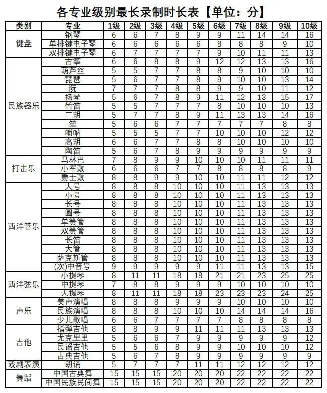 如果演奏(唱)超出预设的录制时间,系统会自动终止录制。考官将根据录像中展示的技术水平进行评定,希望考生在间隔停顿以及演奏速度上把握好时间。如因特殊原因时长不够,可节选片段,但需保留技巧性快板乐段。各专业级别最长录制时长详见下表(仅适用于星音在线app考试录制):