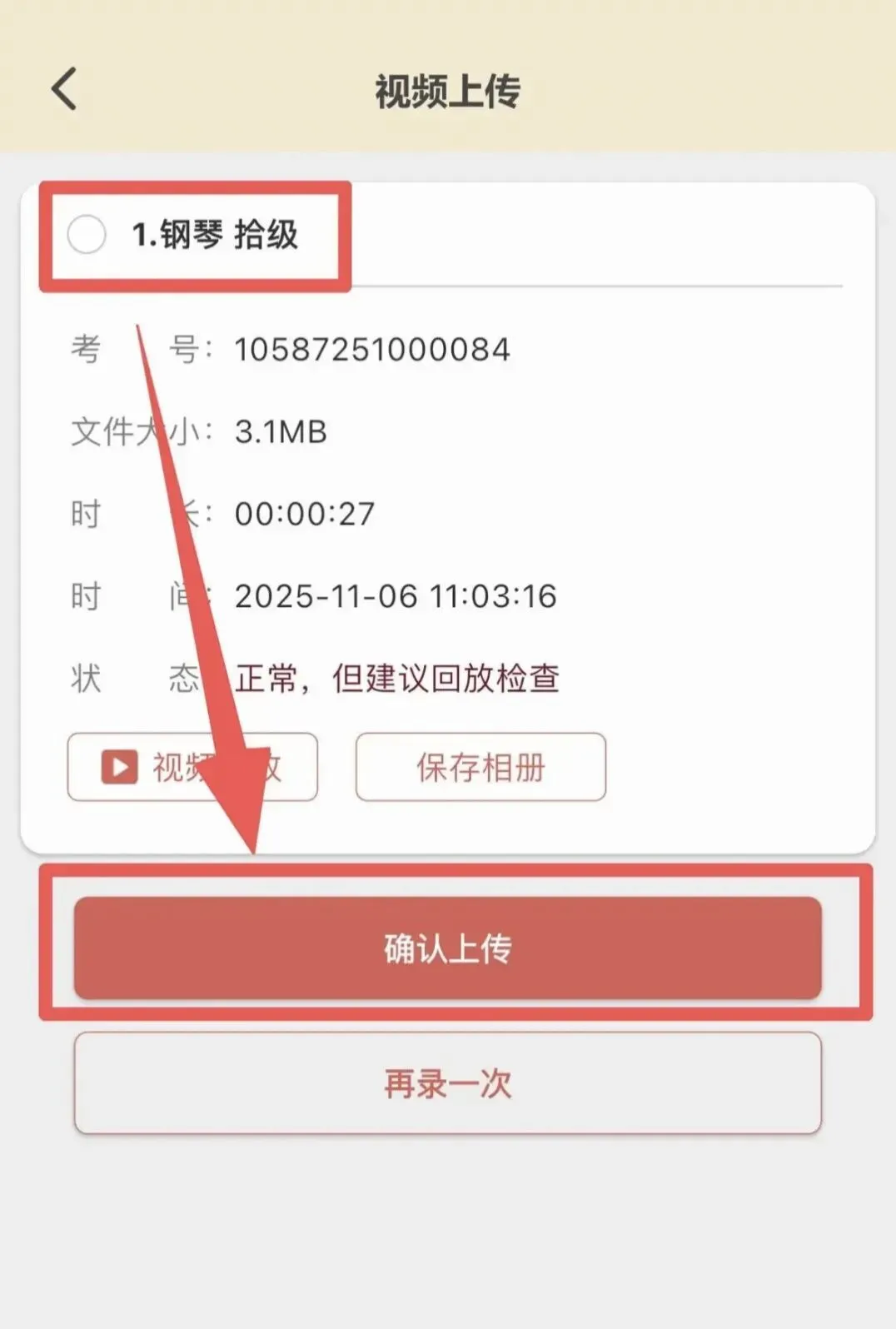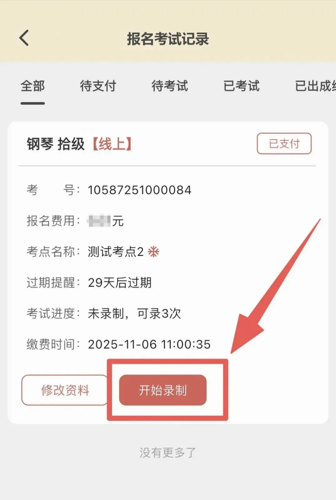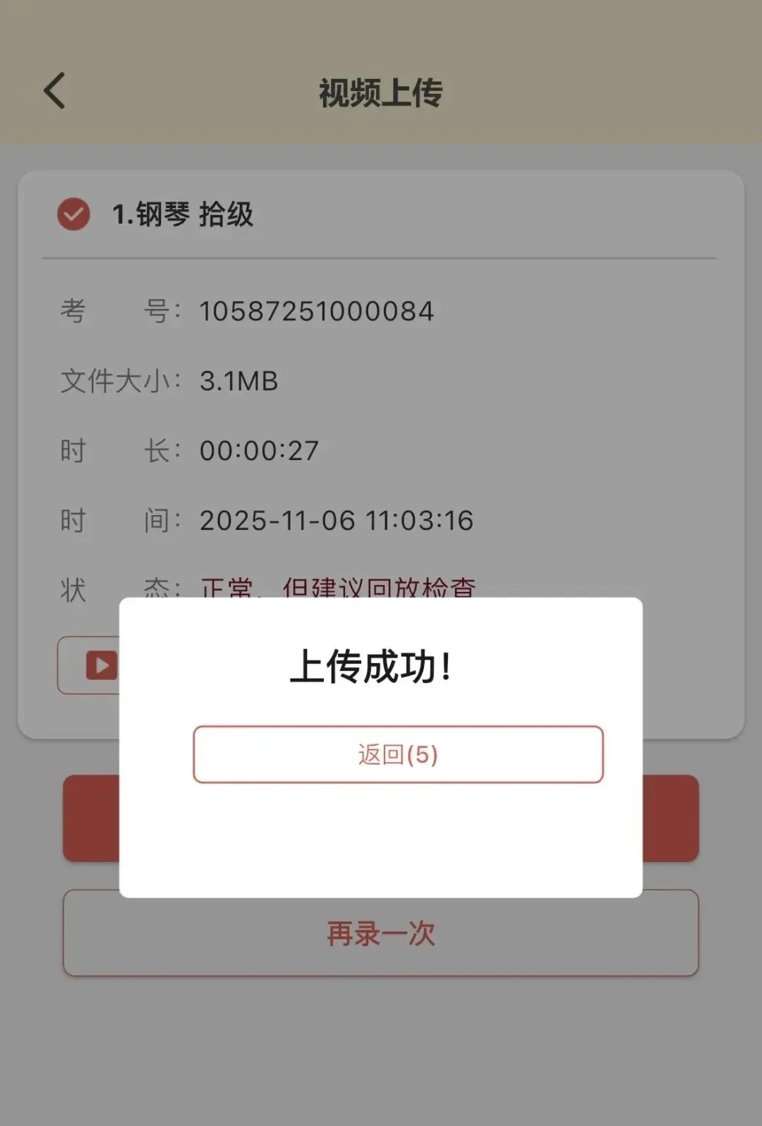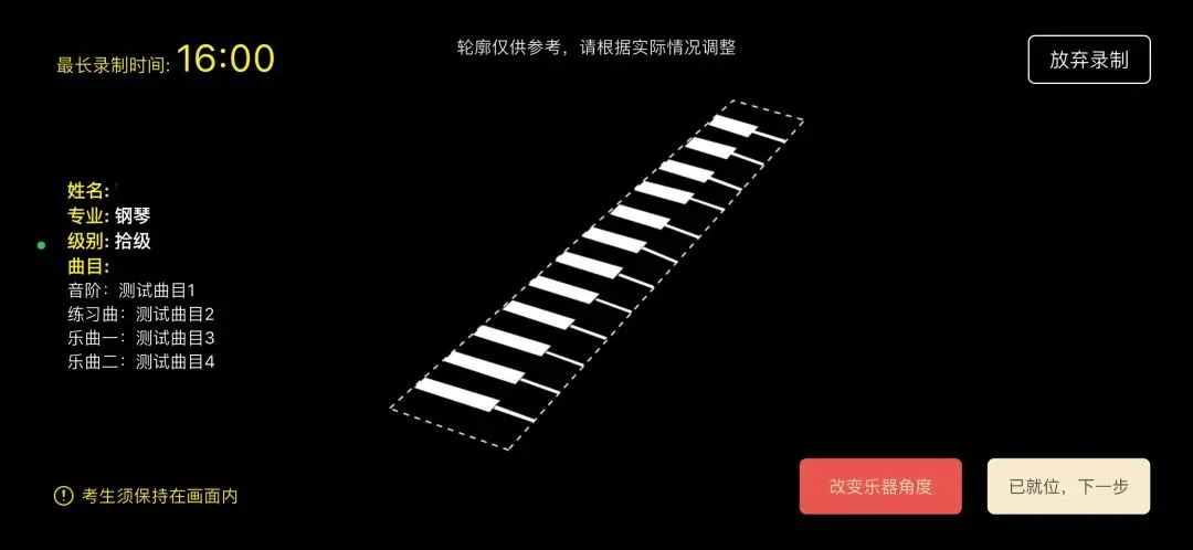 考级视频录制有时长上限,开始录制后即在屏幕左上角显示倒计时,请在倒计时结束前完成所有考试曲目录制。如曲目完整演奏(唱)完毕,还剩余录制时间,可直接按”完成并保存”键提交视频,未达到最长录制时间不影响成绩评定。