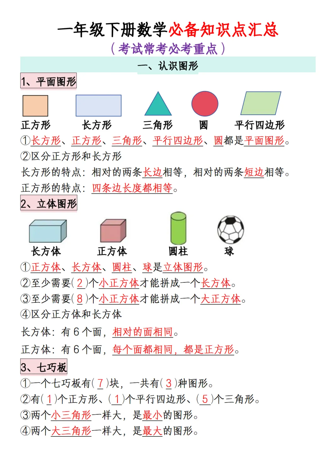 【免费下载】一年级(下)数学 必背知识点汇总