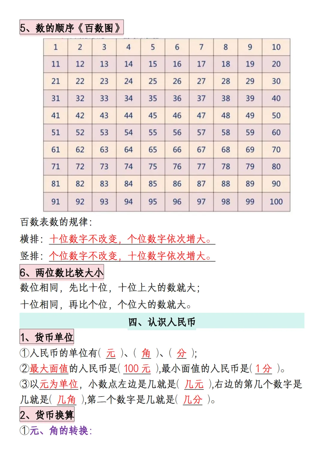 一年级(下)数学 必背知识点汇总