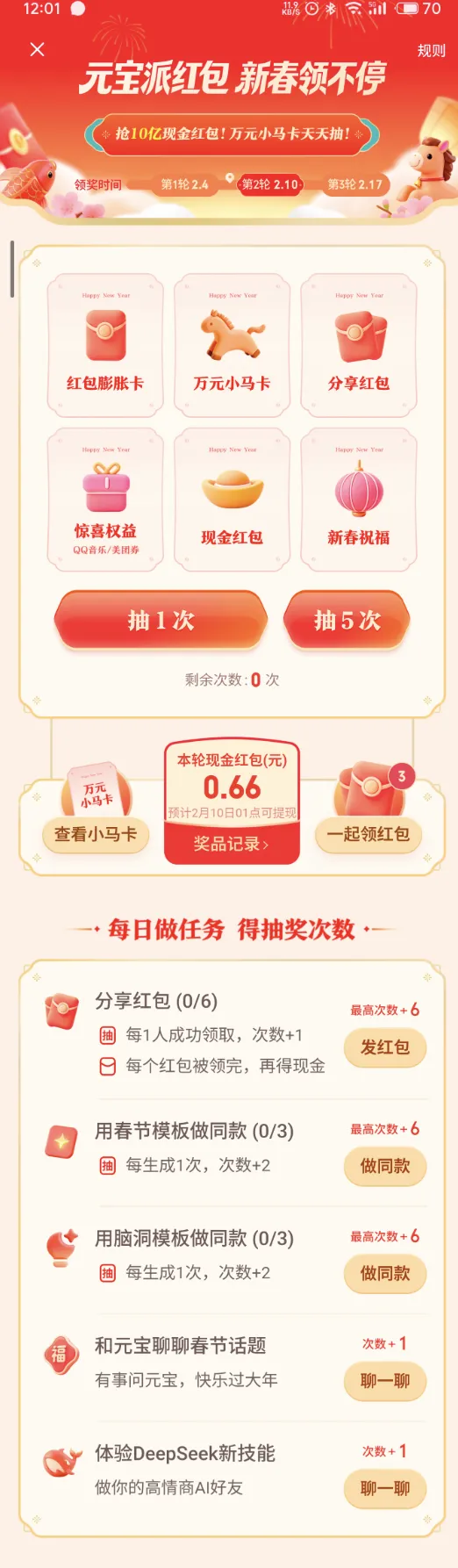 元宝AI红包活动:用户下载App后默认有抽奖次数,完成对应任务也能获得额外抽奖机会,有机会获得万元小马卡