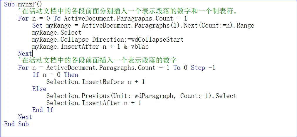 下面我将利用一段代码作为实例。这段代码中,将在活动文档中的各段前面分别插入一个表示段落的数字和一个制表符,这是利用Next方法。然后利用Previous方法,再在各段前面插入一个表示段落的数值。我们先看下面的代码:
