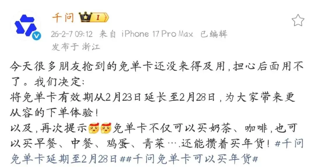千问官方发文称:「决定将免单卡有效期从2月23日延长至2月28日,为大家带来更从容的下单体验!以及再次提示:免单卡不仅可以买奶茶、咖啡,也可以买早餐、中餐、鸡蛋、青菜….」官方还建议先集满21张卡,慢慢错峰下单。