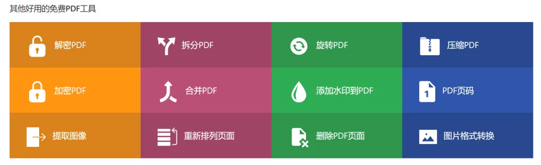 解密PDF、加密PDF、拆分PDF、合并PDF、旋转PDF、添加水印到PDF、压缩PDF、PDF页码、删除PDF页面、重新排列PDF页面等。这些工具超级实用,是你办公不可缺少的私人助手。