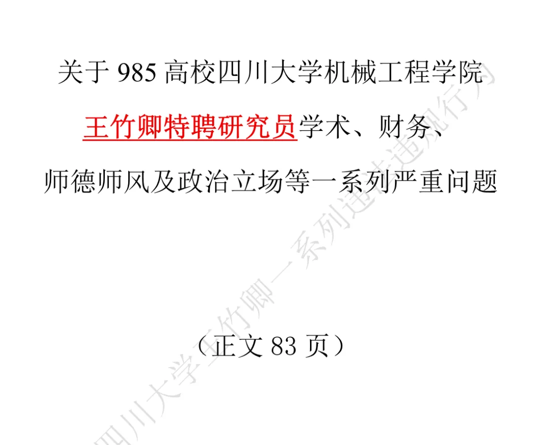 近日,四川大学机械工程学院博导王竹卿被课题组多名硕博生联合实名举报,举报内容涉及学术不端、侵占科研经费、师德失范等多个问题。