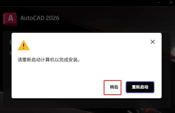 7.提示安装完成后,不要立即启动,询问是否重启计算机,点击【稍后】。