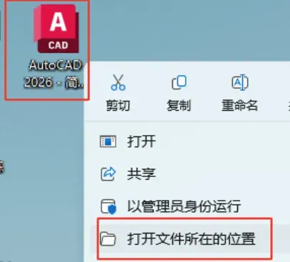 10.在桌面找到刚刚安装完成的CAD2026的图标,鼠标右键选择【打开文件所在位置】。
