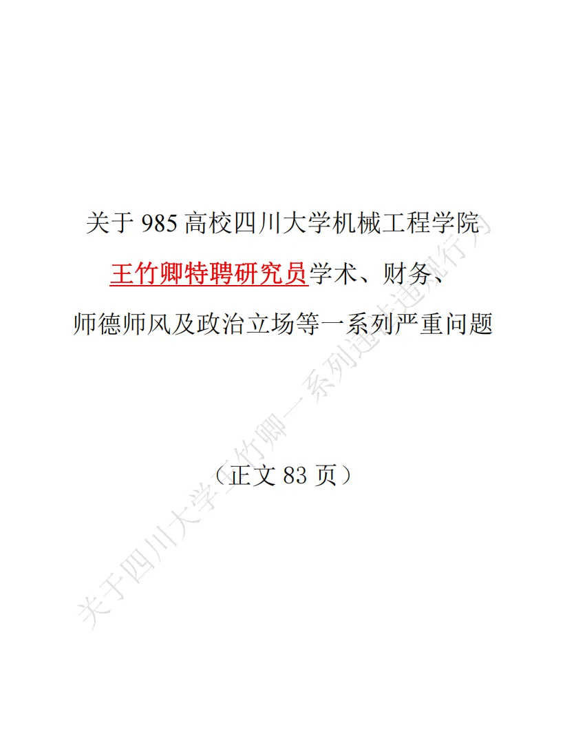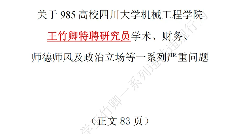 近日,四川大学某课题组多名在读硕博研究生联合举报王竹卿,并制作了长达83页的PDF材料作为依据,指控内容涉及学术不端、侵占经费、师德失范等。