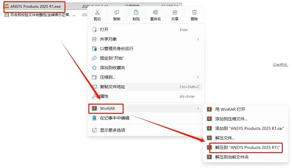1.选中下载的压缩包,然后鼠标右键选择解压到“ANSYS Products 2025 R1”(无法解压?点击安装解压缩软件)