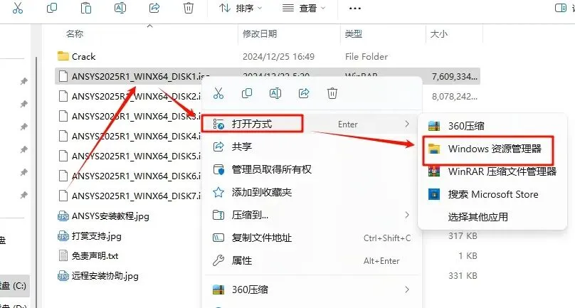 23.返回之前解压的“ANSYS Products 2025 R1”文件夹,选中“ANSYS2025R1_WINX64_DISK1”iso文件,鼠标右键选择“装载”(如果没有“装载”选项的可以右键选择“打开方式—Windows资源管理器”打开)