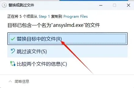 14.点击“替换目标中的文件“(若提示需要权限,勾选”为所有…”,点击“继续”