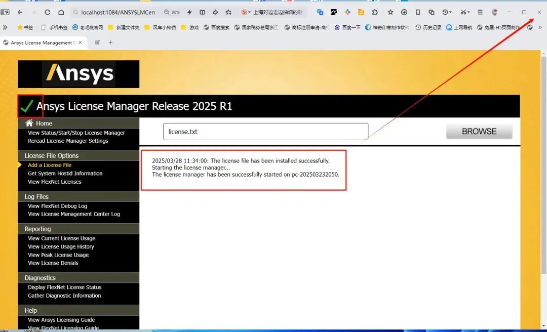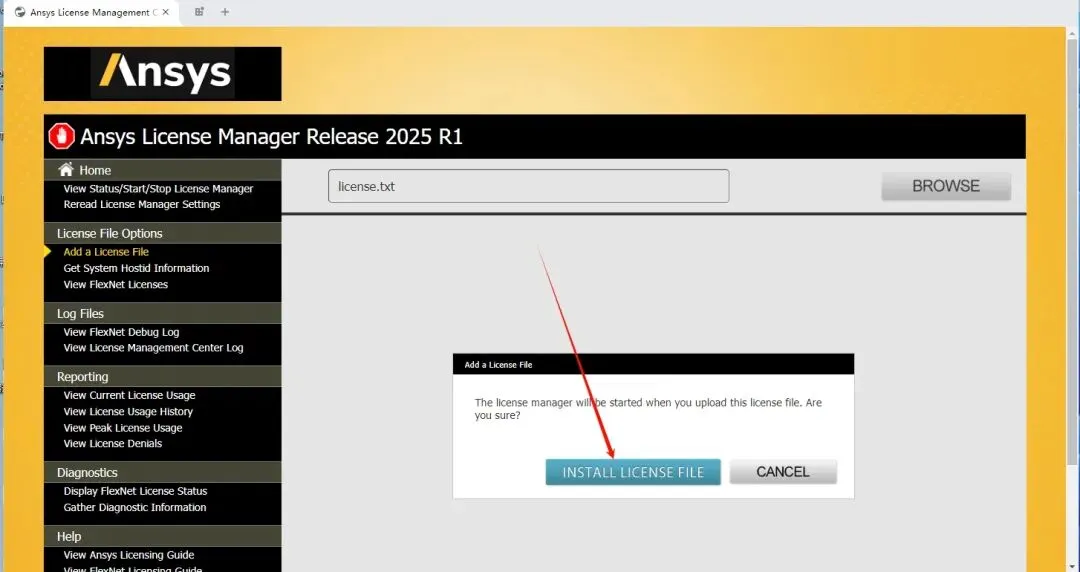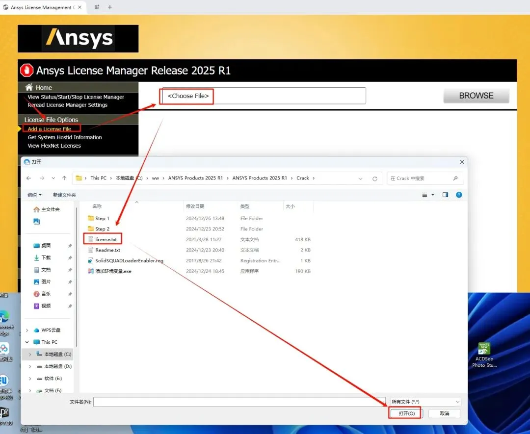 20.返回证书管理中心“ANSYS License Manager Center“界面,点击”Add a License File” ,点击”Choose File” ,浏览选择上一步保存后的”license.txt” 文件(即“ANSYS Products 2025 R1—Crack”文件夹里面),点击 “打开”