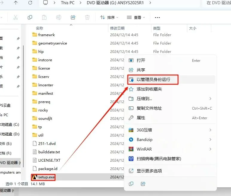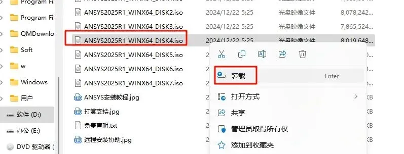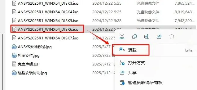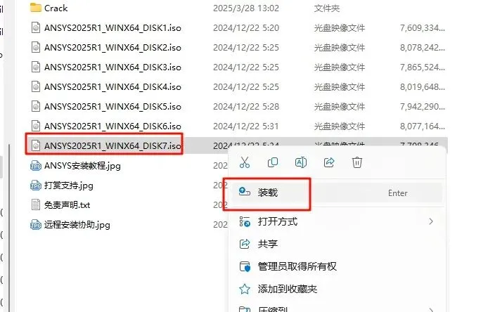 2.打开刚刚解压的文件夹,选中“ANSYS2025R1_WINX64_DISK1”iso文件,鼠标右键选择“装载”(如果没有“装载”选项的可以右键选择“打开方式—Windows资源管理器”打开)
