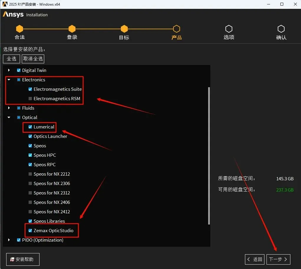 28.选择需要安装的产品,软件默认勾选Electronics、Lumerical、Zemax三个组件,可以根据自己的需要选择,全部安装需要178G的空间,点下“Optical”左边的三角展开符,这里包含了Lumerical、Speos、Speos for NX及Zemax等,点击“下一步”