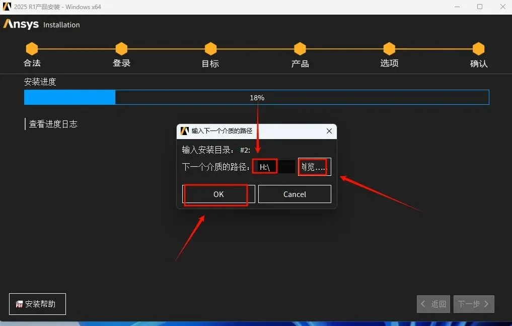 39.回到软件安装界面,点击“浏览”选择“H”盘(上一步显示的盘符),点击“选择文件夹”,点击“OK”,软件继续安装