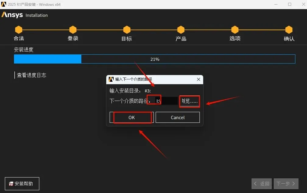 51.回到软件安装界面,点击“浏览”选择“L”盘(上一步显示的盘符),点击“选择文件夹”,点击“OK”,软件继续安装
