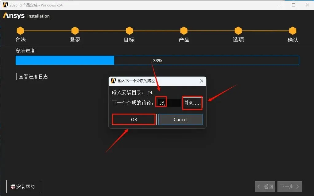 45.回到软件安装界面,点击“浏览”选择“J”盘(上一步显示的盘符),点击“选择文件夹”,点击“OK”,软件继续安装