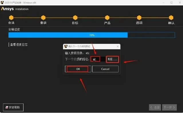 48.回到软件安装界面,点击“浏览”选择“K”盘(上一步显示的盘符),点击“选择文件夹”,点击“OK”,软件继续安装