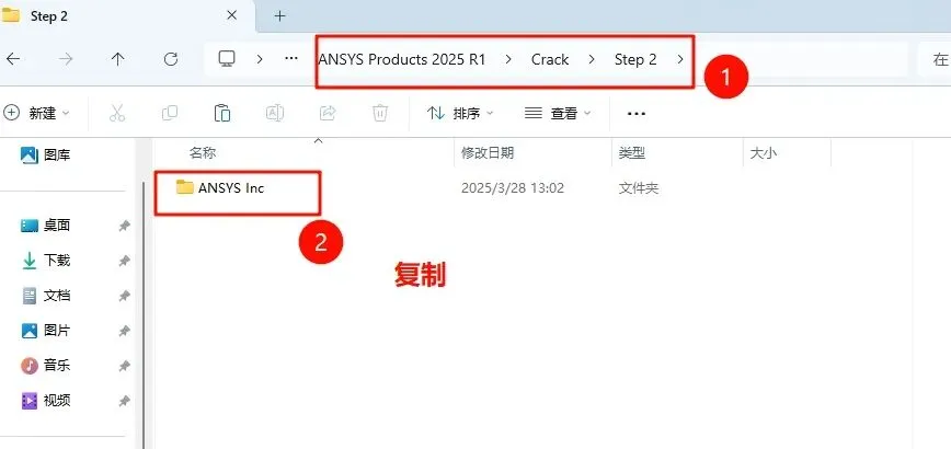 57.返回之前解压的“ANSYS Products 2025 R1”文件夹,依次打开“Crack-Step 2”文件夹,选中该文件夹下的“ANSYS Inc”文件,鼠标右键选择“复制”