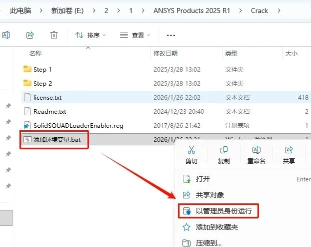 59.返回“Crack”文件夹,选中“添加环境变量.exe”鼠标右键选择“以管理员身份运行”(黑框一闪而过是正常的)
