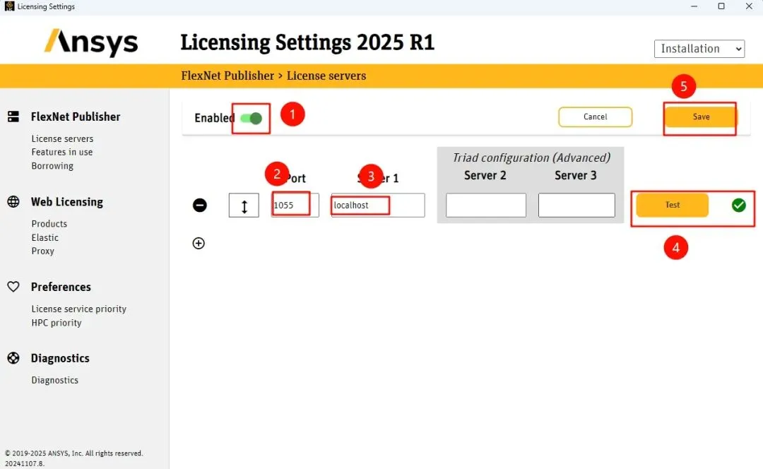 64.选择“Lisence servers”,点击“Enabled“旁边的打开按扭,在“Port”下面的框里输入:1055,在“Server1”下面的框里输入:localhost,点击“Test”,旁边出现绿色的勾,点击”Save“保存