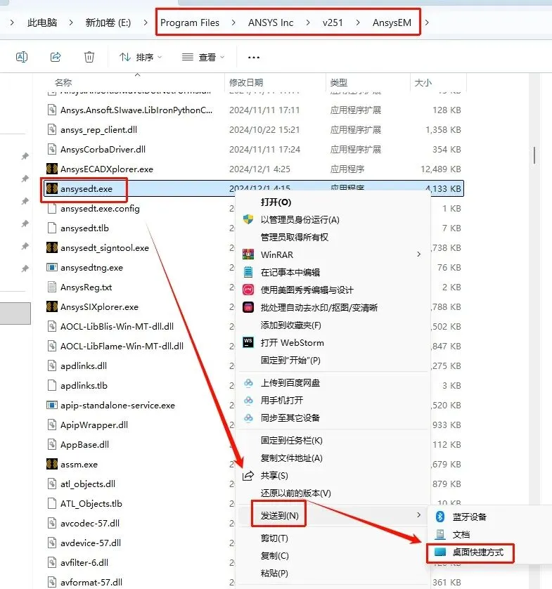 打开Electronics程序位置:G:\Program Files\ANSYS Inc\v251\AnsysEM(参看第27步),选中Electronics启动程序“ansysedt.exe”文件,鼠标右键选择“发送到→桌面快捷方式”