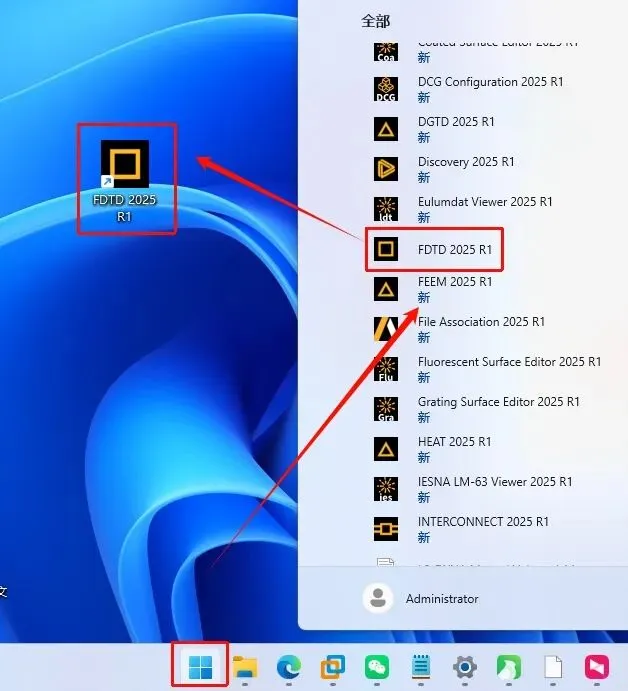 点击“开始“菜单栏,点击“所有应用“,找到Lumerical对应软件,鼠标左键拖拽到桌面上即可创建桌面快捷方式