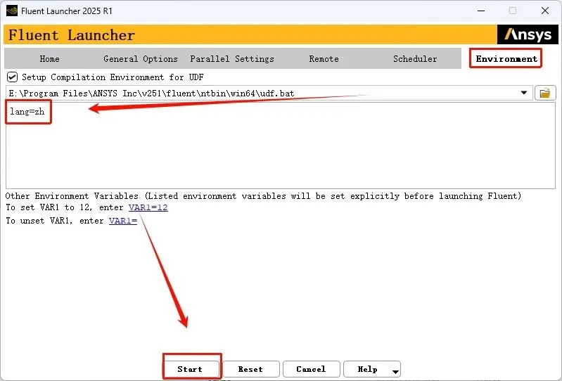 打开Fluent软件,点击“Environment”,输入“lang=zh”,点击“start”即可