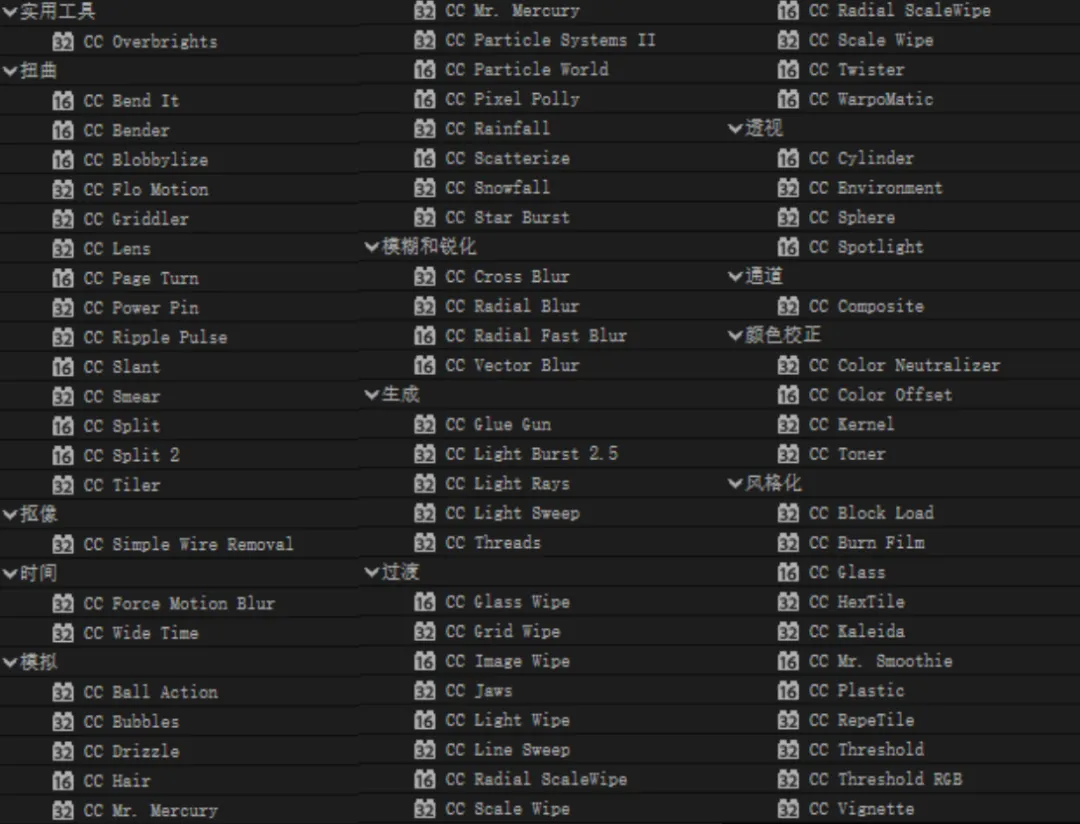 虽然AE 已经更新到了2026年版本,但是AE 常见的内置自带 CycoreFXHD 简称 CC 插件,包含了大量的效果插件,全部都是英文语言。