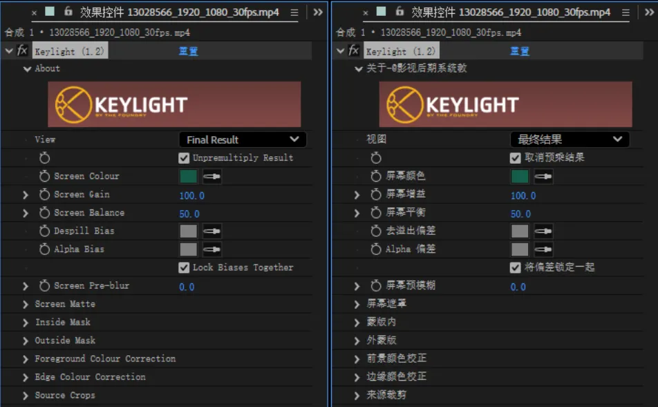 除此之外还有常用的键控抠像插件 Keylight,也同样默认英文语言。