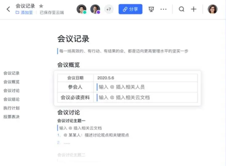 会议前,组织者可以用飞书文档整理会议材料,页数不限,以把事讲清为标准,并将在线文档发给参会者,提倡大家会前浏览(但不强制),让与会者从一开始就获取会议议题的所有关键信息,提升与会参与度。