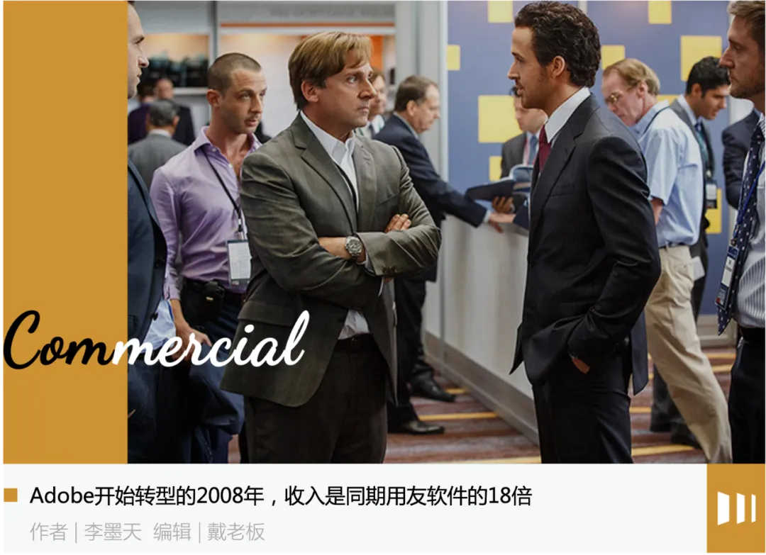 作为传统时代最成功的软件公司之一,Adobe的转型始于2008年。时值金融危机过境,大量企业开始收缩,很多客户选择省钱继续用旧版本,而不是支付高昂的软件购买费用。