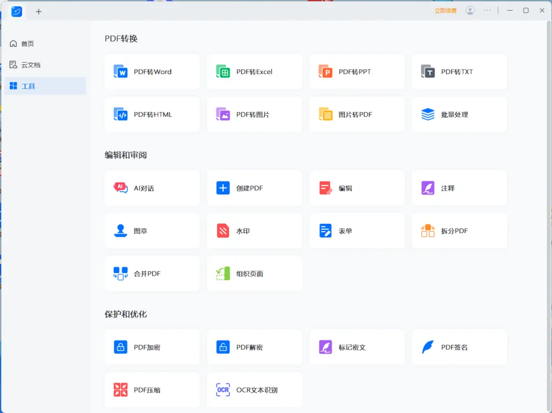 创建 PDF 支持从文件创建和创建空白文档,也可以直接打开现有的 PDF 文件进行编辑。