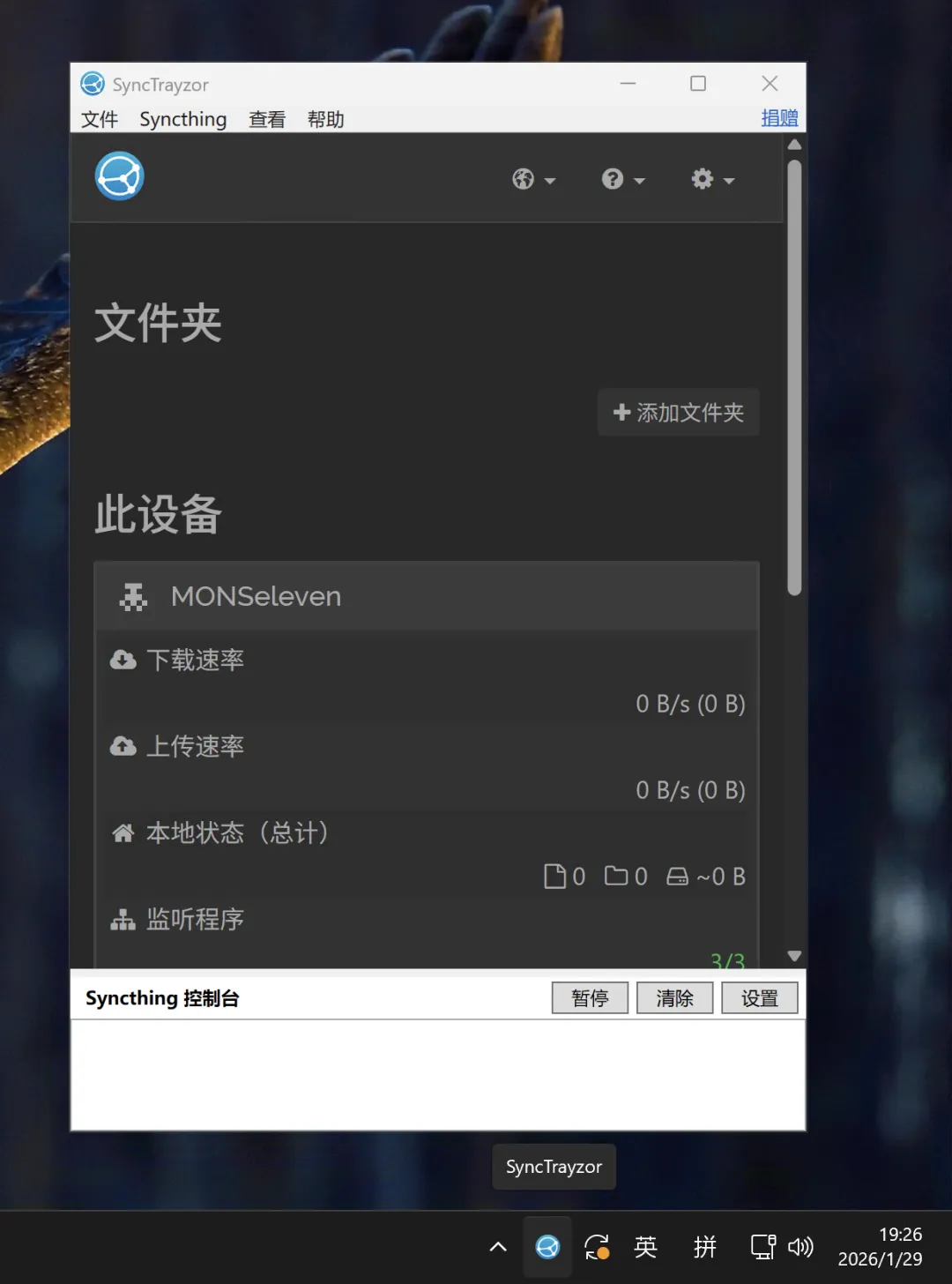 正常使用 Syncthing 会有一个黑乎乎的命令行窗口,这个工具就简单了,直接装它,不再需要单独安装 Syncthing 了。