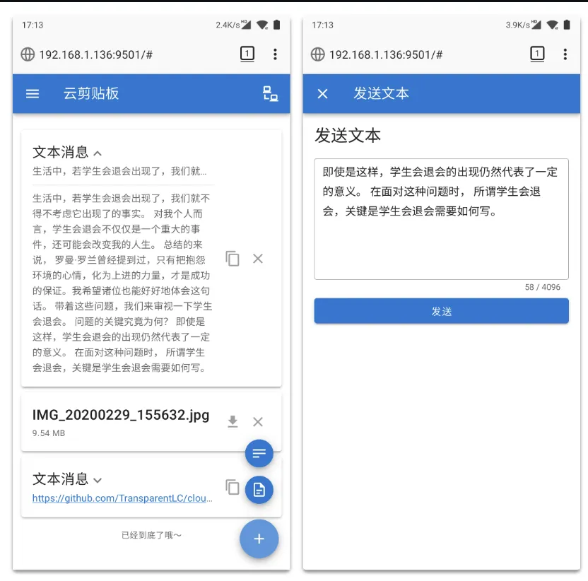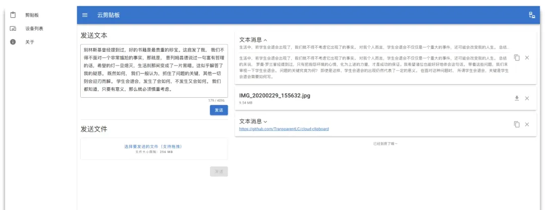 来自发现频道的局域网分享剪贴板工具,有多种方式部署(Docker、源码、二进制、OpenWrt等),支持 Windows、macOS、Linux、Android、iOS,支持配置历史记录和文件过期时间,支持传输纯文本和文件