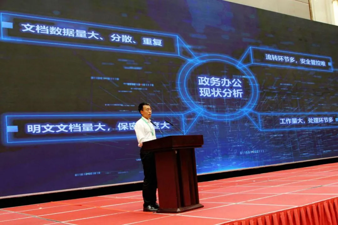 作为拥有自主知识产权的国内领先办公软件企业,金山办公软件一直致力于解决各类用户在办公领域遇到的痛点。在本次大会上,金山办公软件带来主题演讲——《数聚动能,智慧未来》,与参会人员探讨并分享了WPS系列办公软件及其平台是如何基于大数据提升政务办公效率和管理的现代化。基于诸多成功项目的经验积累,金山办公软件总结了政务办公领域存在的四大主要痛点:文档数据增加导致文档管理混乱、公文分享存在安全隐患、明文文档无法高效安全管控、文档流转环节多无法安全管控。