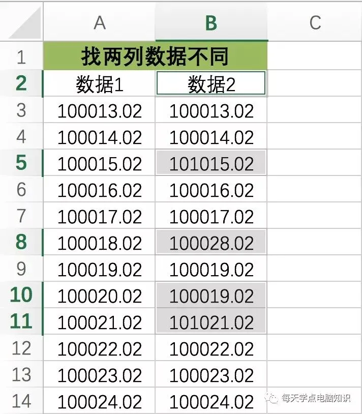 3、如何对比两列数据的不同,并找出不同的数据,效果如图: