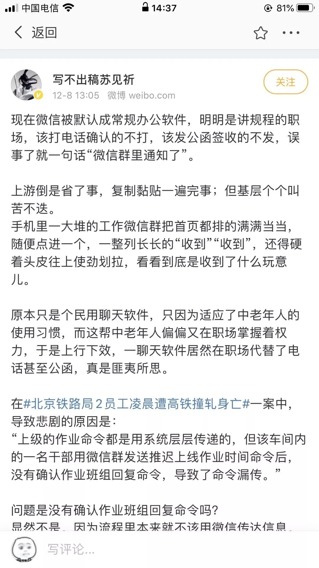 在这起事故中作业消息按流程是不应该使用微信进行通知的,铁路局本身就有自己专门的更可靠的消息传递方式。